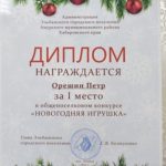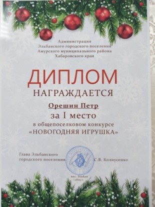 Наши маленькие мастера с радостью приняли участие в ежегодном общепоселковом конкурсе «Новогодняя игрушка». И их старания были щедро вознаграждены! Пётр Орешин из группы № 9 получил заслуженный диплом 1 степени за свою чудесную игрушку, а София Наумова из группы № 14 была отмечена дипломом 2 степени. Теперь эти яркие и оригинальные творения украшают нарядную ёлку в нашем посёлке, принося радость всем жителям Эльбана!