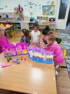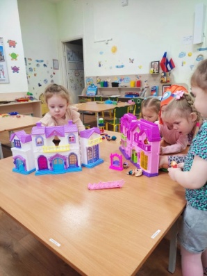 Девочки с восторгом погрузились в сюжетно-ролевую игру «Дочки-матери» с кукольным домиком. Эта игра не только учит их заботиться о куклах и развивает фантазию при строительстве, но и помогает налаживать дружеские отношения друг с другом.