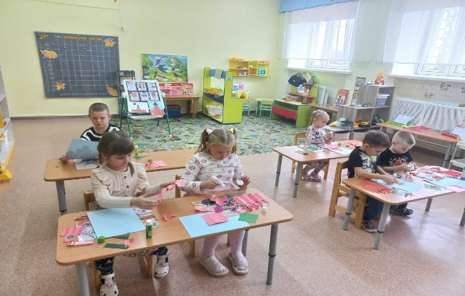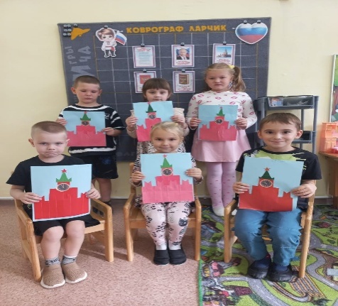 В старшей группе компенсирующей направленности ребята с увлечением занимались художественным творчеством. Под чутким руководством воспитателя Вегериной Светланы Вадимовны они создавали аппликацию «Спасская башня Кремля», тем самым прикоснувшись к истории и архитектурным шедеврам России.